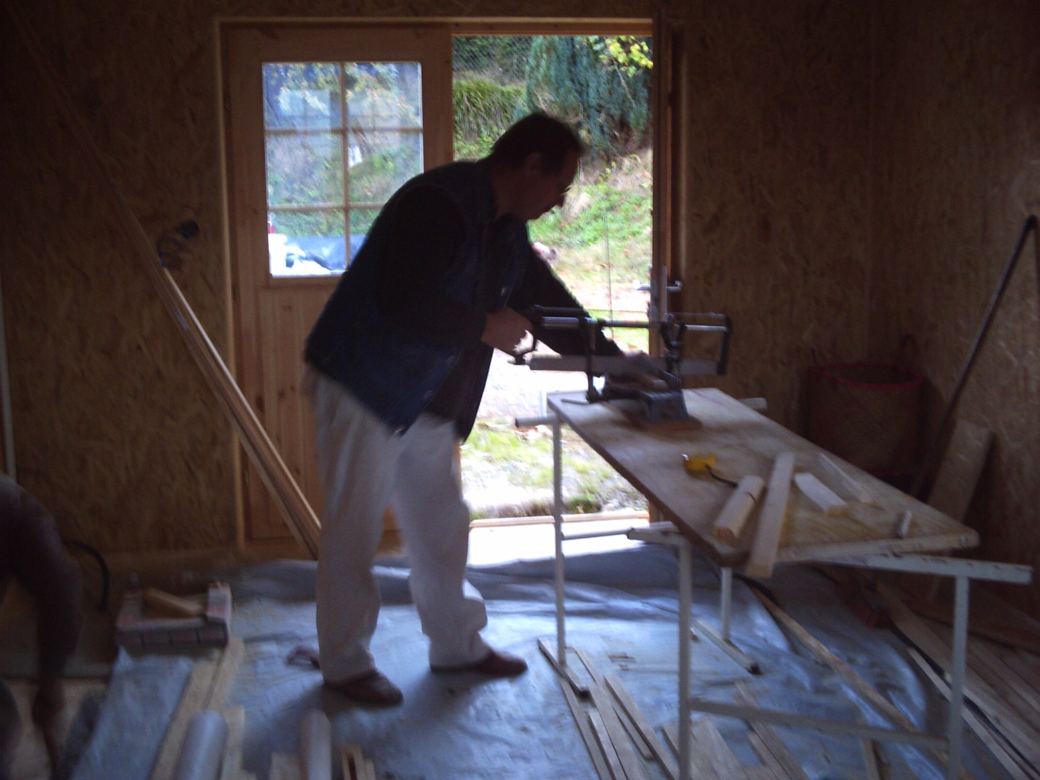 15 octobre 2009, dans le séjour qui sert provisoirement d'atelier, découpe des plinthes avec l'outil qui permet d'obtenir des angles à 45 degrés