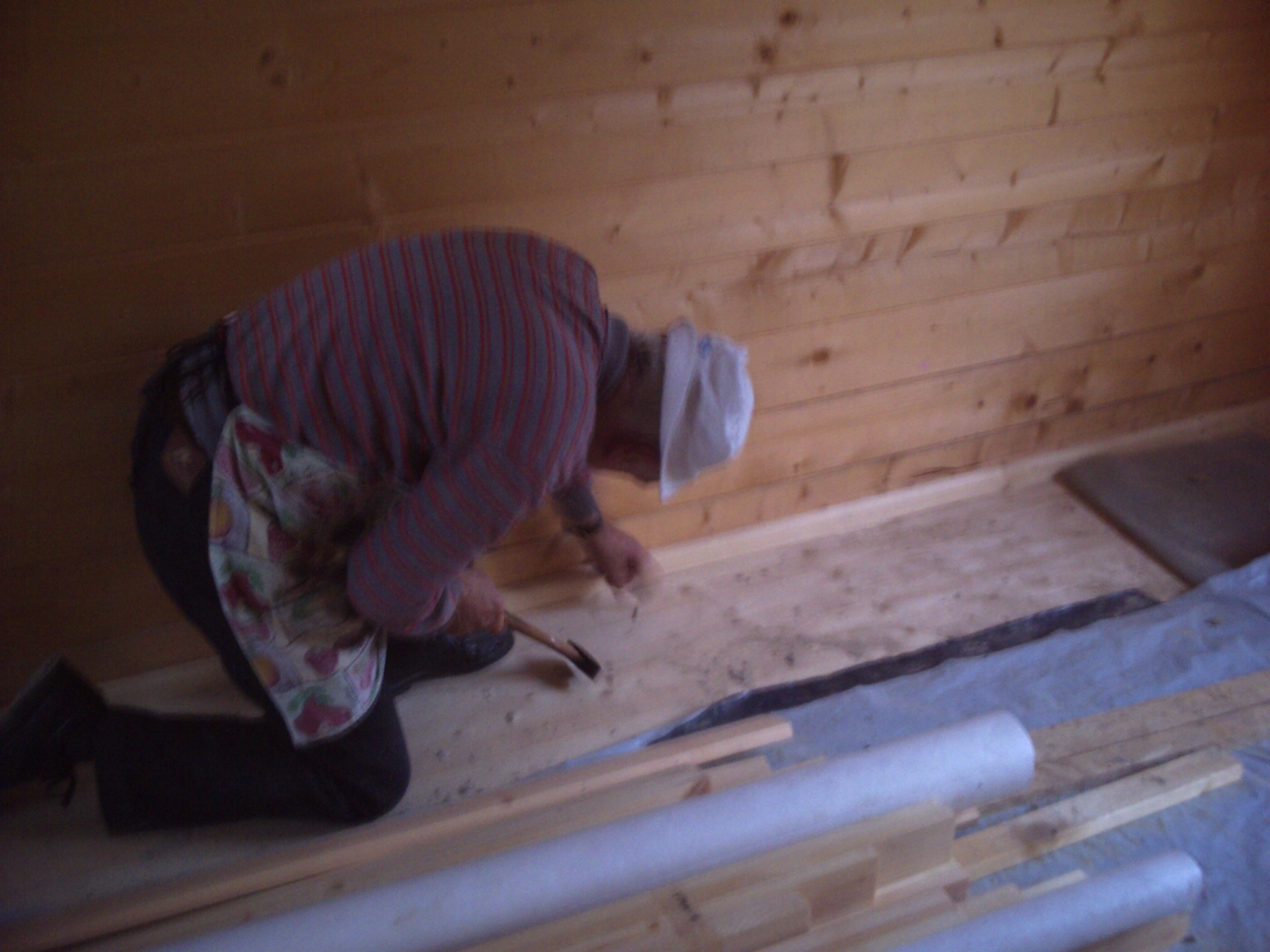 15 octobre 2009, pose d'une plinthe dans le séjour dont le plancher est protégé par une bâche en attendant d'être vitrifié